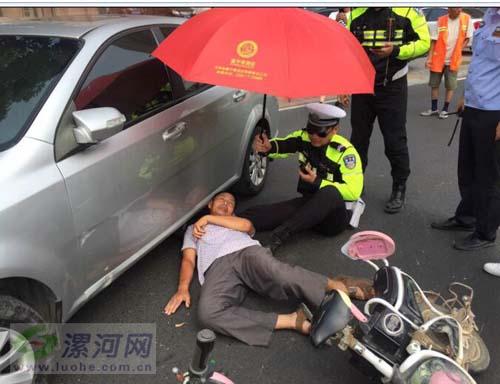 漯河市交警支隊(duì)秩序管理示范大隊(duì)騎警吳沛洋:當(dāng)時(shí)我跟隊(duì)友王冰潔巡邏到嵩山西支路的時(shí)候,發(fā)現(xiàn)一場(chǎng)車(chē)禍,我們立即上去查看,當(dāng)時(shí)發(fā)現(xiàn)地上躺了一位六十多歲的老人,經(jīng)過(guò)簡(jiǎn)單的詢問(wèn)老人出現(xiàn)了頭暈,胸悶的癥狀,根據(jù)經(jīng)驗(yàn)確定他有可能是心臟病,因?yàn)楫?dāng)時(shí)天氣溫度較高, 地表溫度可能要達(dá)到四十多度,老人心臟病不能移動(dòng),只能平躺,我就把老人的頭稍微抬起來(lái)一點(diǎn),由于沒(méi)有支撐點(diǎn),情急之下我就坐在地上伸出腿,讓老人枕著我的腿,等待120的救援。