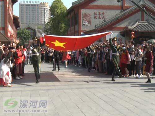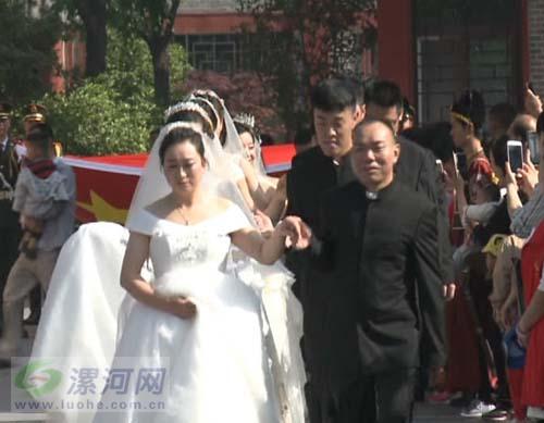 今年的青年集體婚禮,漯河市首次將“愛國文化元素”融入其中,特別邀請了天安門原國旗護衛(wèi)隊、中國第一國旗手高紅浦及戰(zhàn)友現場舉行升旗儀式。上午9點,莊嚴肅穆的升國旗儀式開始,12對新人和現場的親朋好友在飄揚的國旗下共唱國歌。升旗儀式結束后,高紅浦和戰(zhàn)友還給每對新人送上了一面鮮艷的五星紅旗作為新婚禮物。