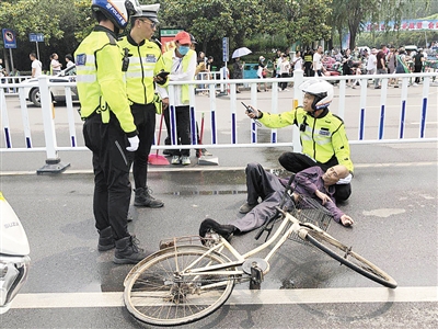 當(dāng)天上午11點(diǎn)20分,一名騎自行車的老人在淞江路與嵩山路交叉口附近突然暈倒,正在巡邏的騎警王孟召和2名同事恰巧路過。