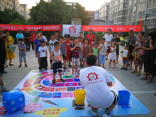 8月16日下午,我市志愿者在市區(qū)長江路沙澧錦繡花園小區(qū),為居民們講解垃圾分類知識,并進行垃圾分類小游戲。記者  朱紅  攝