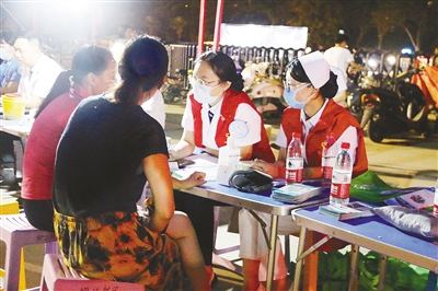 6月13日晚,漯河柳江醫(yī)院組織十多名醫(yī)護(hù)人員走進(jìn)市體育場夜間廣場消費(fèi)點(diǎn)開展義診活動(dòng)。