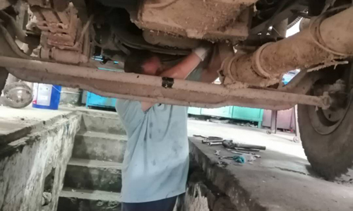 “把黃油遞給我”,這是該中心修理廠張長奇的聲音,8月13日11點半,只見他蹲在1米多深熱浪滾滾的水泥地溝里,藏藍(lán)色工作服已經(jīng)沾滿了油污,手套早已變得烏黑,握著工具在地溝里查看車輛底盤,他揮汗如雨,頭發(fā)衣服被汗水和車上滴下來的污水侵染,散發(fā)出一股刺鼻的異味。地溝很暗,借著工作燈照射過來的燈光,張長奇準(zhǔn)確地往加油口打入了黃油。