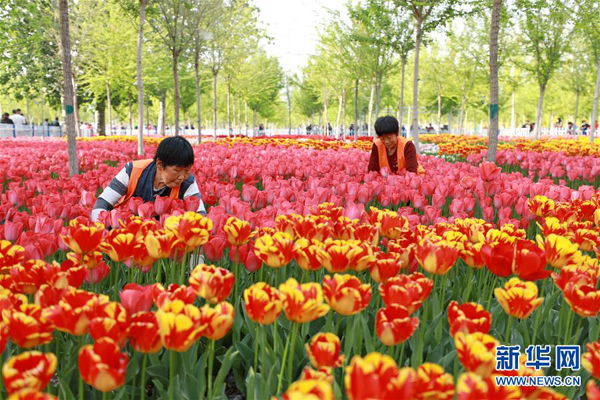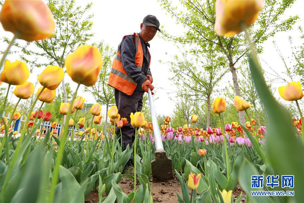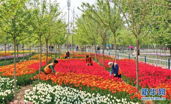 4月19日,工人在河北省辛集市區(qū)打理鮮花。 近日,河北省辛集市在城市道路兩側(cè)和公園內(nèi)栽植的上萬株郁金香競相綻放,繽紛的鮮花成為城市一道亮麗的風(fēng)景線。 新華社記者 牟宇 攝