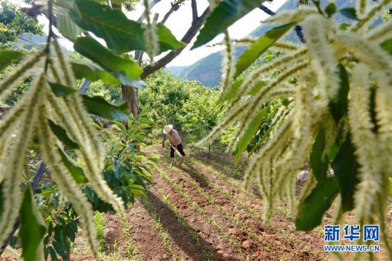 6月10日,河北省遷安市大五里鄉(xiāng)農(nóng)民在板栗林中打理套種的農(nóng)作物。 近日,河北省遷安市栗花進(jìn)入盛花期。遷安市板栗栽培歷史悠久,現(xiàn)有種植面積11萬畝,是帶動(dòng)當(dāng)?shù)剞r(nóng)民增收的特色產(chǎn)業(yè)。 新華社記者 牟宇 攝