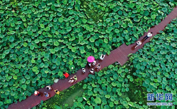 6月28日,游客在廣西柳州市柳江區(qū)百朋鎮(zhèn)萬畝荷塘里觀賞荷花(無人機(jī)照片)。 連日來,廣西柳州市柳江區(qū)百朋鎮(zhèn)萬畝荷塘種植的春季蓮藕喜獲豐收,各色荷花競相綻放,吸引游客前來賞玩。百朋鎮(zhèn)是柳州市柳江區(qū)雙季蓮藕的主產(chǎn)區(qū),雙季蓮藕種植面積達(dá)3.2萬畝。同時,當(dāng)?shù)胤e極發(fā)展荷花景區(qū)生態(tài)旅游休閑項(xiàng)目,260多戶貧困戶通過蓮藕種植及旅游產(chǎn)業(yè)實(shí)現(xiàn)脫貧。 新華社發(fā)(黎寒池 攝)