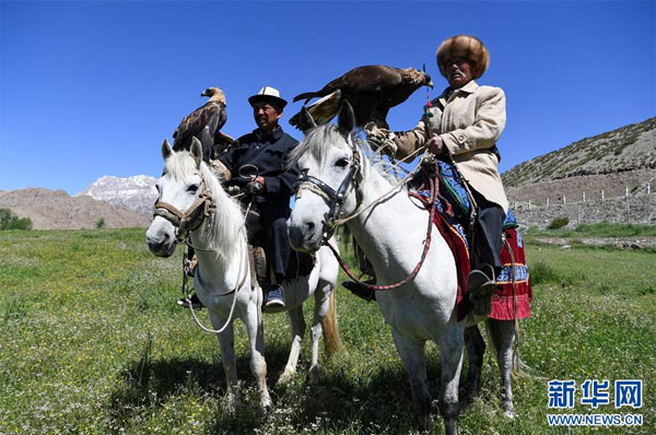 6月29日,庫爾馬西·胡特曼(右)和他的徒弟們展示獵鷹。 新華社記者 宋彥樺 攝