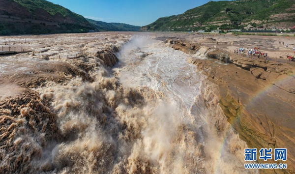 7月7日,黃河壺口瀑布主瀑上出現(xiàn)彩虹(無人機照片)。 近日,位于秦晉大峽谷的黃河壺口瀑布出現(xiàn)難得一見的“金色瀑布”景觀。 新華社記者 陶明 攝