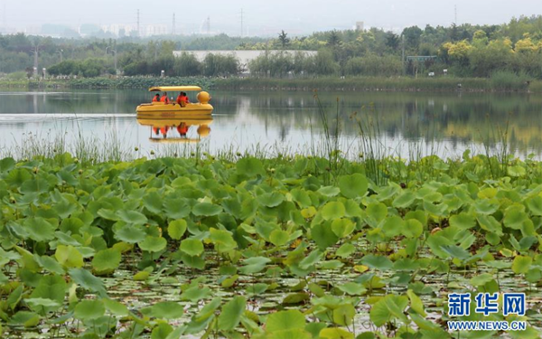 7月9日,在位于石家莊市鹿泉區(qū)的龍泉湖濕地公園,游客在湖內(nèi)劃船游玩。 位于河北省石家莊市鹿泉區(qū)的龍泉湖濕地公園,規(guī)劃面積5000余畝,是該市打造的較大規(guī)模城市濕地公園。近年來,石家莊市以“城在景中、景在城中、見山見水”的發(fā)展理念,將多年堆積廢物的垃圾溝改造成為水清草綠的生態(tài)濕地公園。昔日垃圾場變身“天然氧吧”,成為市民觀光、休閑、健身的好去處。 新華社發(fā)(黑乃樂 攝)