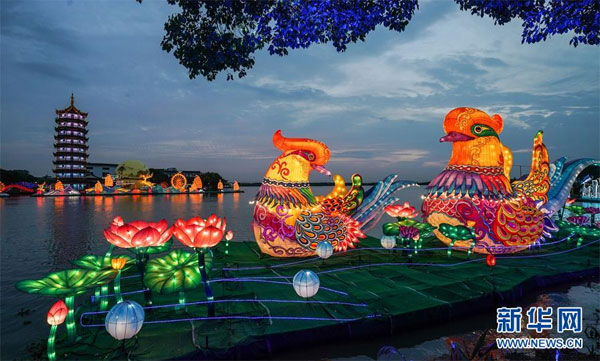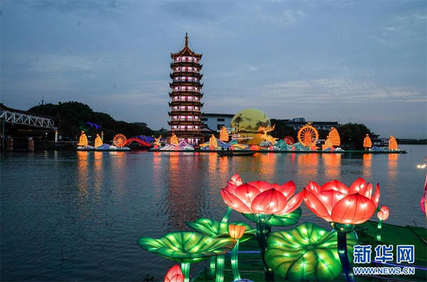 9月28日拍攝的“情意綿綿”燈組(前右)與“月滿周莊”燈組(后左)。 當日,2020海峽兩岸(昆山)中秋燈會在江蘇昆山開幕,為期一個月。燈會設(shè)置的水鄉(xiāng)周莊燈區(qū)以水鄉(xiāng)、古鎮(zhèn)、田園江南為依托,將傳統(tǒng)彩燈與現(xiàn)代光影藝術(shù)相融合,打造“水韻芳華”夜周莊。 新華社記者 楊磊 攝
