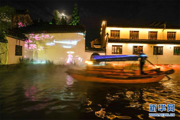 9月28日,一艘游船劃過燈光璀璨的水巷。 當日,2020海峽兩岸(昆山)中秋燈會在江蘇昆山開幕,為期一個月。燈會設(shè)置的水鄉(xiāng)周莊燈區(qū)以水鄉(xiāng)、古鎮(zhèn)、田園江南為依托,將傳統(tǒng)彩燈與現(xiàn)代光影藝術(shù)相融合,打造“水韻芳華”夜周莊。 新華社記者 楊磊 攝