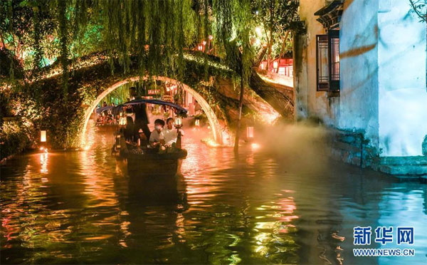 9月28日,游客乘船游覽燈光璀璨的水巷。 當日,2020海峽兩岸(昆山)中秋燈會在江蘇昆山開幕,為期一個月。燈會設(shè)置的水鄉(xiāng)周莊燈區(qū)以水鄉(xiāng)、古鎮(zhèn)、田園江南為依托,將傳統(tǒng)彩燈與現(xiàn)代光影藝術(shù)相融合,打造“水韻芳華”夜周莊。 新華社記者 楊磊 攝