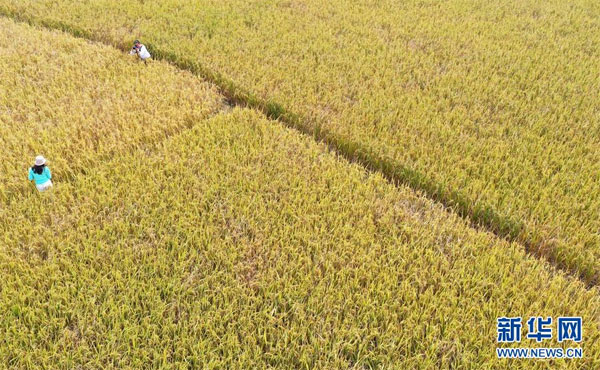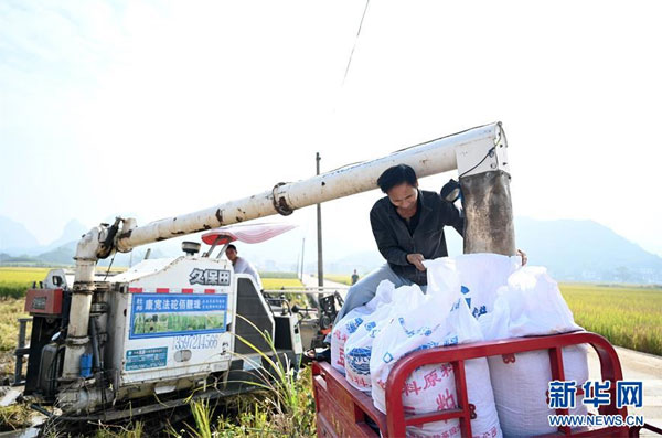 廣西柳州:深秋稻香 11月1日,在廣西柳州市柳江區(qū)進(jìn)德鎮(zhèn)泗浪村,農(nóng)民在裝運(yùn)剛收割的稻谷。