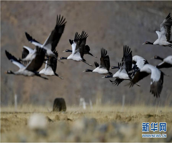 黑頸鶴在自然保護(hù)區(qū)里飛翔(2021年1月3日攝)。