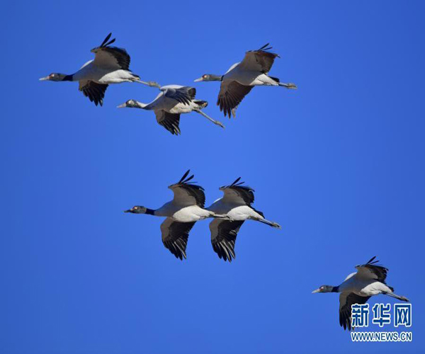 黑頸鶴在自然保護(hù)區(qū)上空飛翔(2021年1月3日攝)。