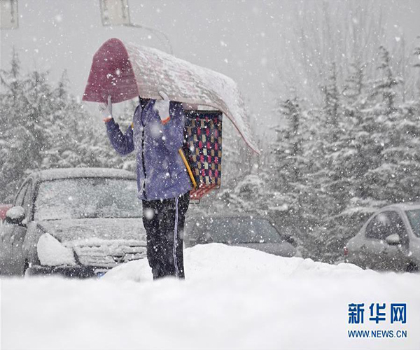 1月5日,在山東煙臺街頭,行人冒雪出行。 當日是小寒節(jié)氣,受強冷空氣影響,山東煙臺迎來降雪。