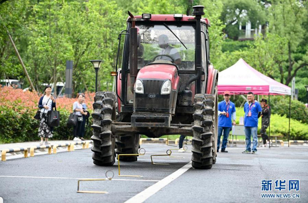 5月17日,在浙江省金華市示范性實踐基地,農業(yè)職業(yè)技能競賽選手進行拖拉機田間開溝模擬作業(yè)。新華社發(fā)(胡肖飛 攝)