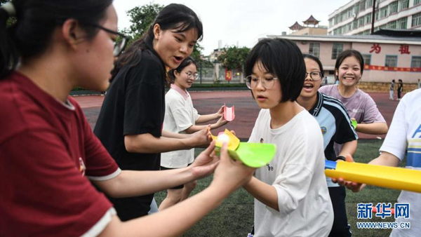 6月1日,在廣西河池市都安瑤族自治縣高級中學操場上,高三年級女生在玩乒乓球接龍游戲。