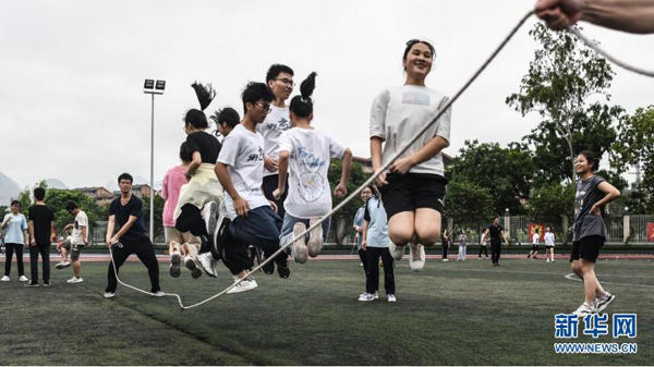 6月1日,在廣西河池市都安瑤族自治縣高級中學操場上,高三年級學生在開展跳繩比賽。