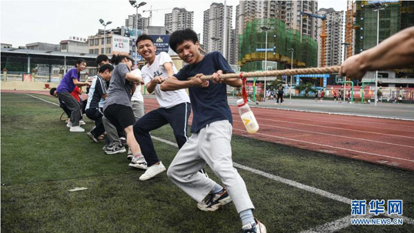 6月1日,在廣西河池市都安瑤族自治縣高級中學操場上,高三年級學生在開展拔河比賽。