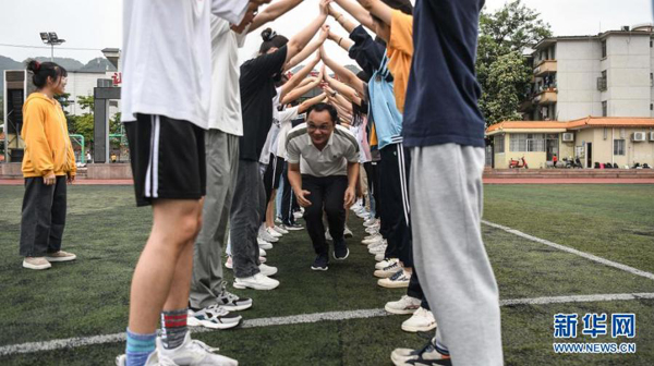 6月1日,在廣西河池市都安瑤族自治縣高級中學操場上,高三年級一位班主任帶領(lǐng)學生開展游戲活動。