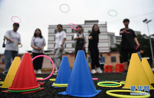 6月1日,廣西河池市都安瑤族自治縣高級中學高三學生在操場上玩套圈圈游戲。