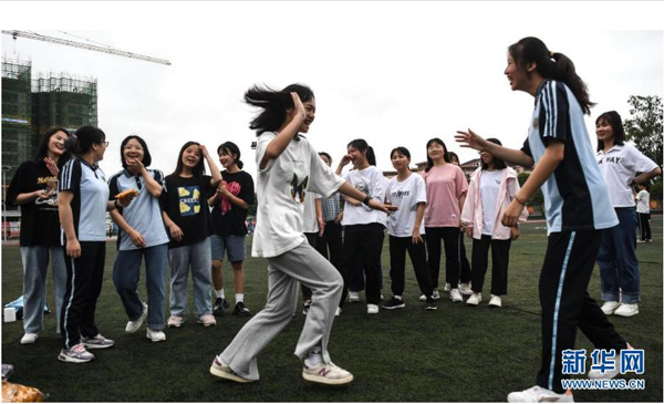 6月1日,在廣西河池市都安瑤族自治縣高級中學操場上,高三年級女生在玩游戲。