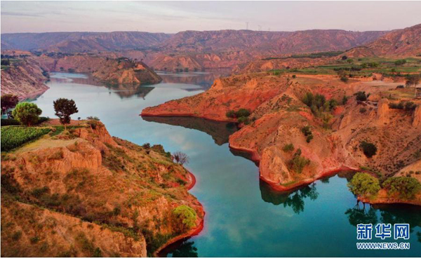 8月6日,朝霞映照下的靖邊縣龍洲鎮(zhèn)波浪谷丹霞景區(qū)(無(wú)人機(jī)照片)。