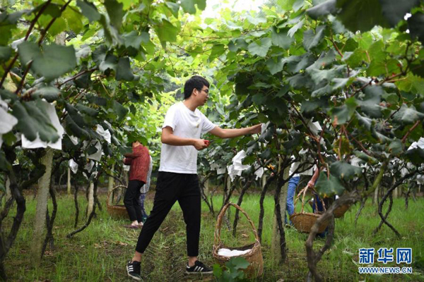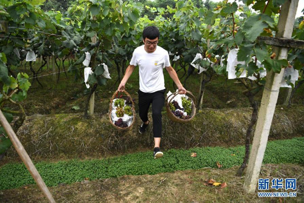 8月10日,丁翔在農(nóng)場(chǎng)葡萄園里采摘葡萄。