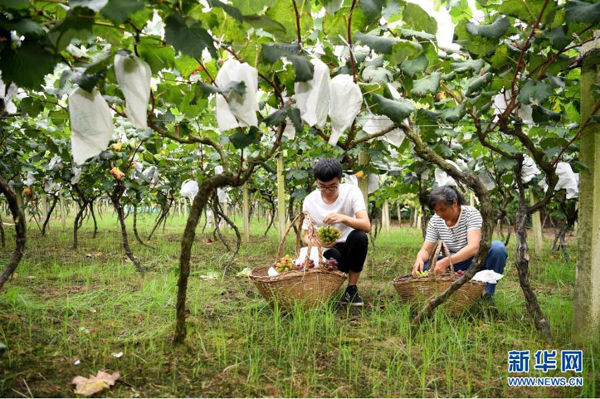 8月10日,丁翔(左)在農(nóng)場(chǎng)葡萄園里采摘上市葡萄。新華社記者 劉軍喜 攝