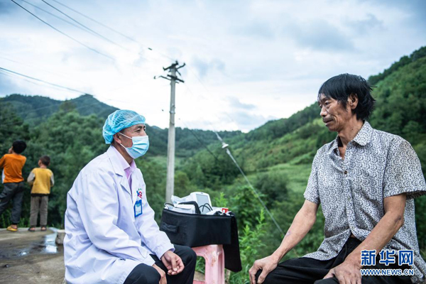 章忠武在和村民周永林交流,詢問(wèn)周永林的糖尿病情況(8月16日攝)。新華社記者 陶亮 攝