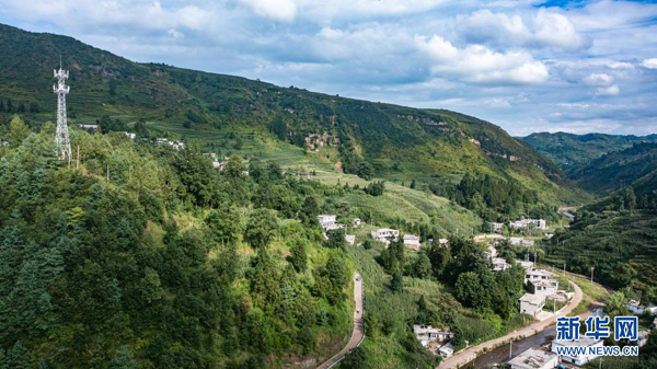章忠武駕駛摩托車在前往羊場(chǎng)村村民家的盤山路上(8月16日攝,無(wú)人機(jī)照片)。新華社記者 陶亮 攝