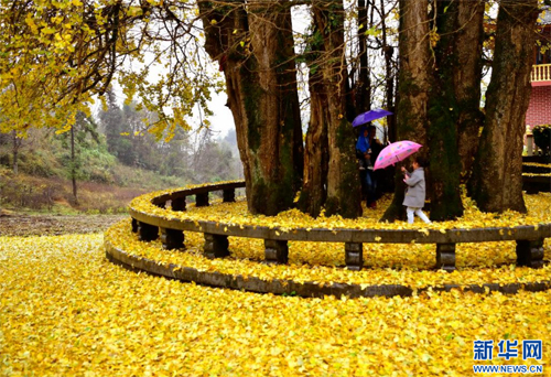 初冬時(shí)節(jié),銀杏樹(shù)葉變黃,落葉猶如給地面鋪上了一層“黃金毯”,吸引游人觀賞。 新華社發(fā)(宋文攝)
