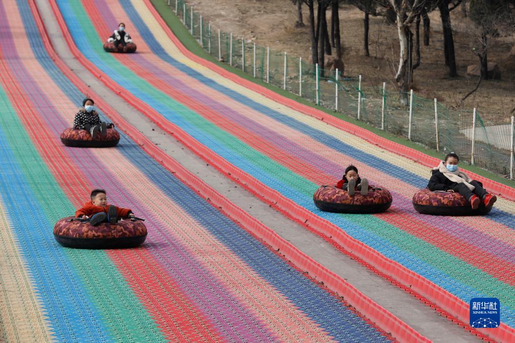 2月8日,小朋友們?cè)趶埌藰蜴?zhèn)“鄉(xiāng)村游樂(lè)場(chǎng)”玩彩虹滑道。