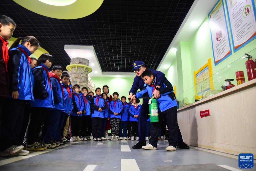 2月17日,浙江省建德市壽昌第一小學(xué)開展“安全教育 牢記于心”為主題的開學(xué)第一課消防安全知識教育活動(dòng)。這是消防員在消防科普體驗(yàn)館里向?qū)W生講解如何正確使用滅火器。