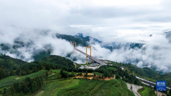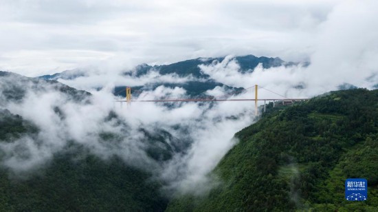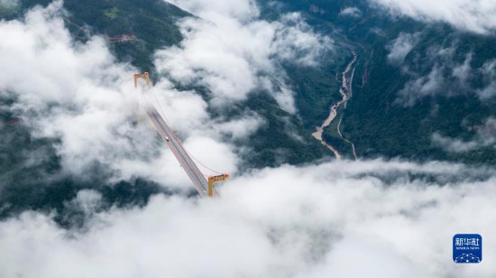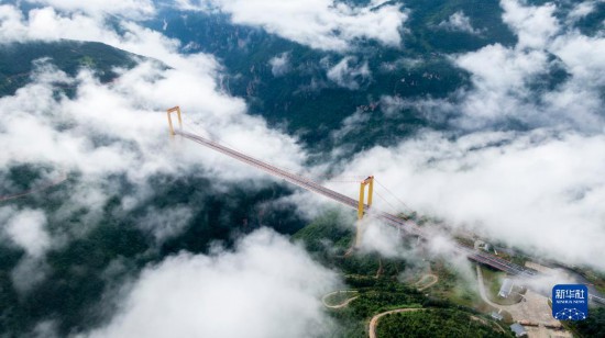 普立大橋位于云南省曲靖市宣威市,橫跨寶山、普立兩個(gè)鄉(xiāng)鎮(zhèn),是一座高速公路鋼箱梁懸索橋,全長(zhǎng)1040米,橋面距離谷底達(dá)500米。大橋所在地山勢(shì)陡峭,六月當(dāng)?shù)赜昙旧介g云霧繚繞,黃色的大橋在云海之中若隱若現(xiàn),宛如建設(shè)在云層之上。