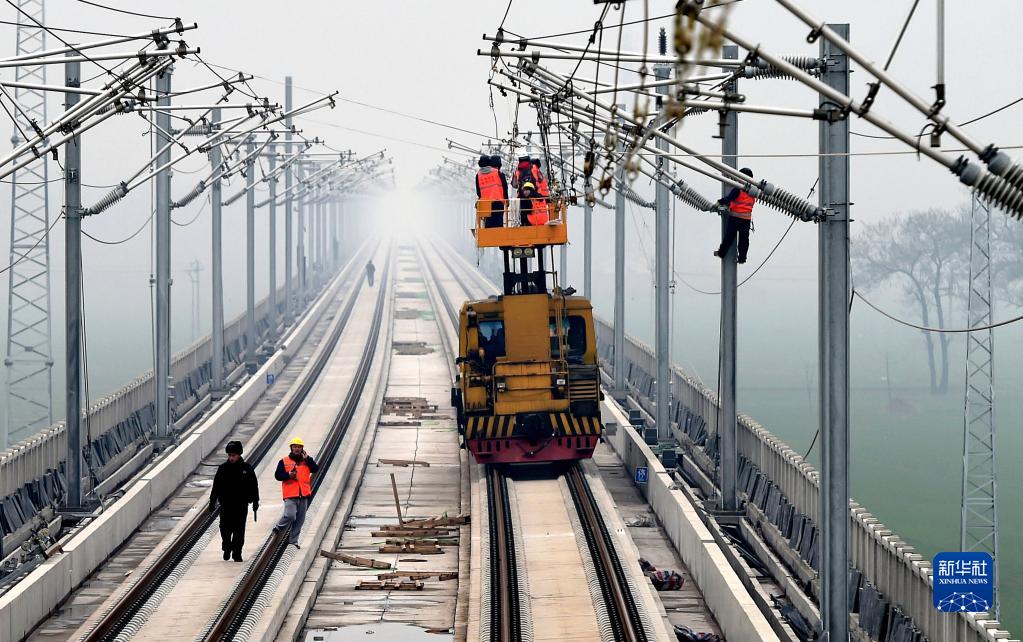中鐵電氣化局集團(tuán)三公司的工作人員在工程車上架設(shè)鄭徐高鐵接觸網(wǎng)導(dǎo)線(2015年12月7日攝)。