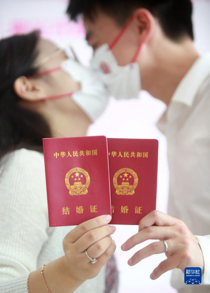 8月4日,在河北省石家莊市欒城區(qū)民政局婚姻登記處,一對新人領取結婚證后拍照留念。
