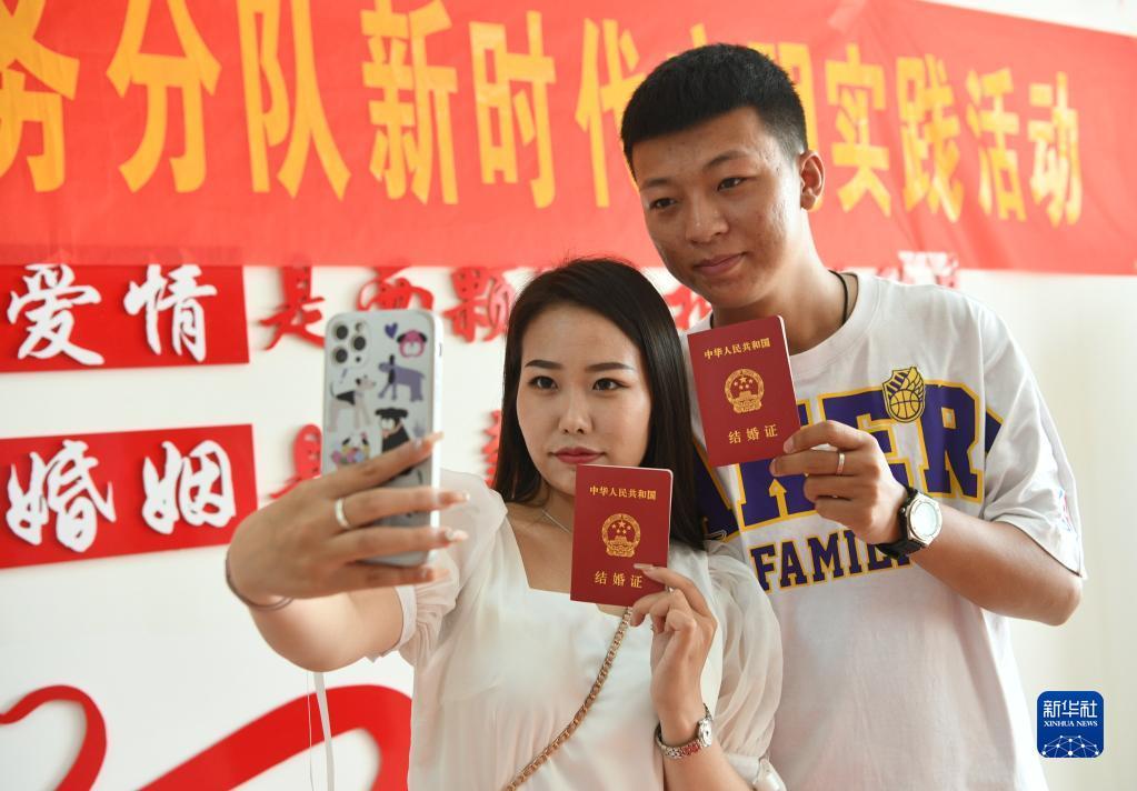 8月4日,在山東省青島市西海岸新區(qū)民政局婚姻登記處,一對新人領取結婚證后拍照留念。