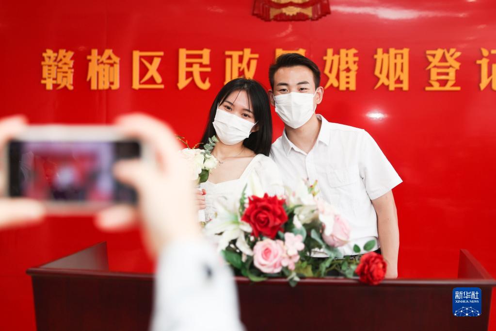 8月4日,在江蘇省連云港市贛榆區(qū)民政局婚姻登記處,一對新人領取結婚證后拍照留念。