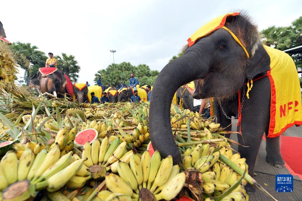 當(dāng)日是泰國一年一度的大象日,泰國芭堤雅東芭樂園在這一天為大象奉上了豐盛的水果自助餐。