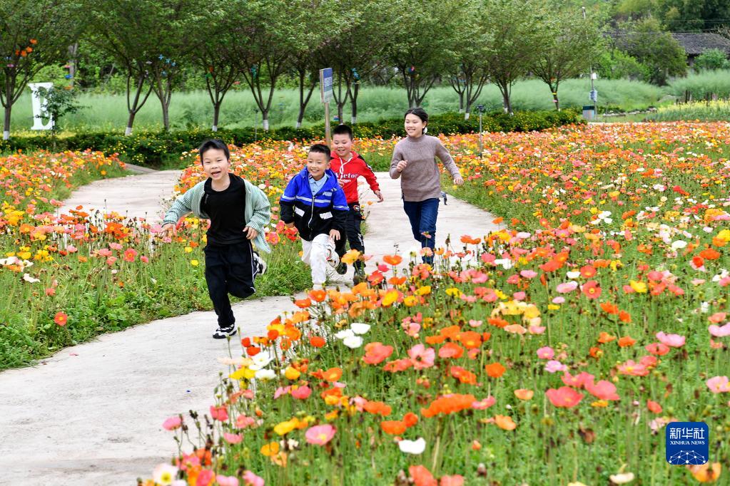 4月5日,游人在四川省廣安市岳池縣銀城花海踏青游玩。