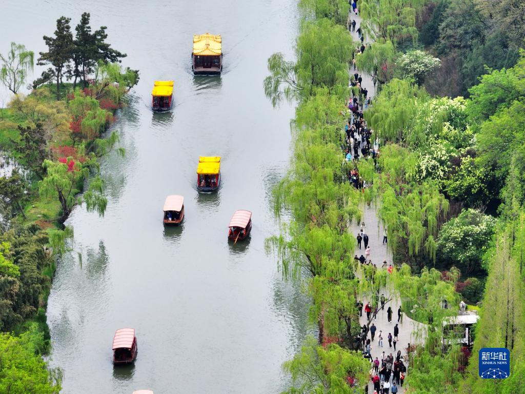 4月5日,游客在江蘇揚州瘦西湖風景區(qū)游玩(無人機照片)。