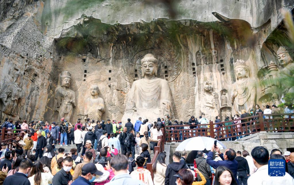 4月5日,游客在河南省洛陽市龍門石窟景區(qū)游覽。
