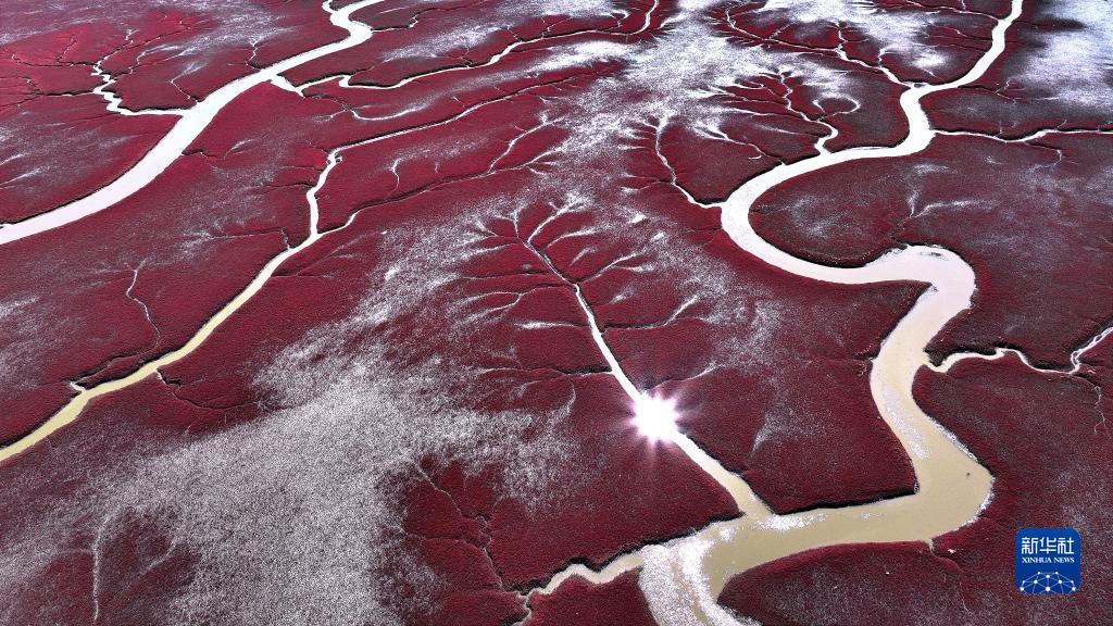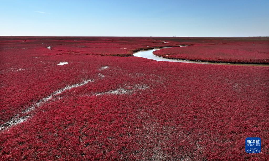 盤(pán)錦紅海灘國(guó)家風(fēng)景廊道景區(qū)內(nèi)的紅海灘(9月12日攝,無(wú)人機(jī)照片)。