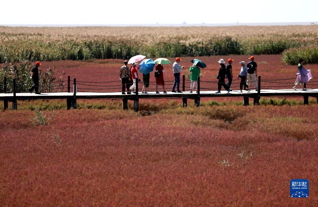 9月12日,游客在盤(pán)錦紅海灘國(guó)家風(fēng)景廊道景區(qū)游覽。