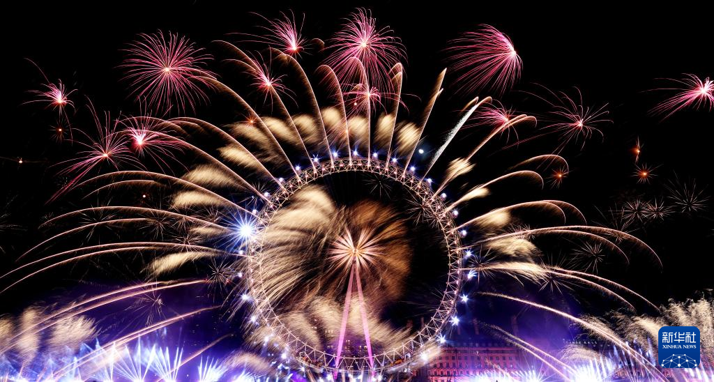 2024年1月1日凌晨,新年焰火在英國倫敦的倫敦眼上空綻放。