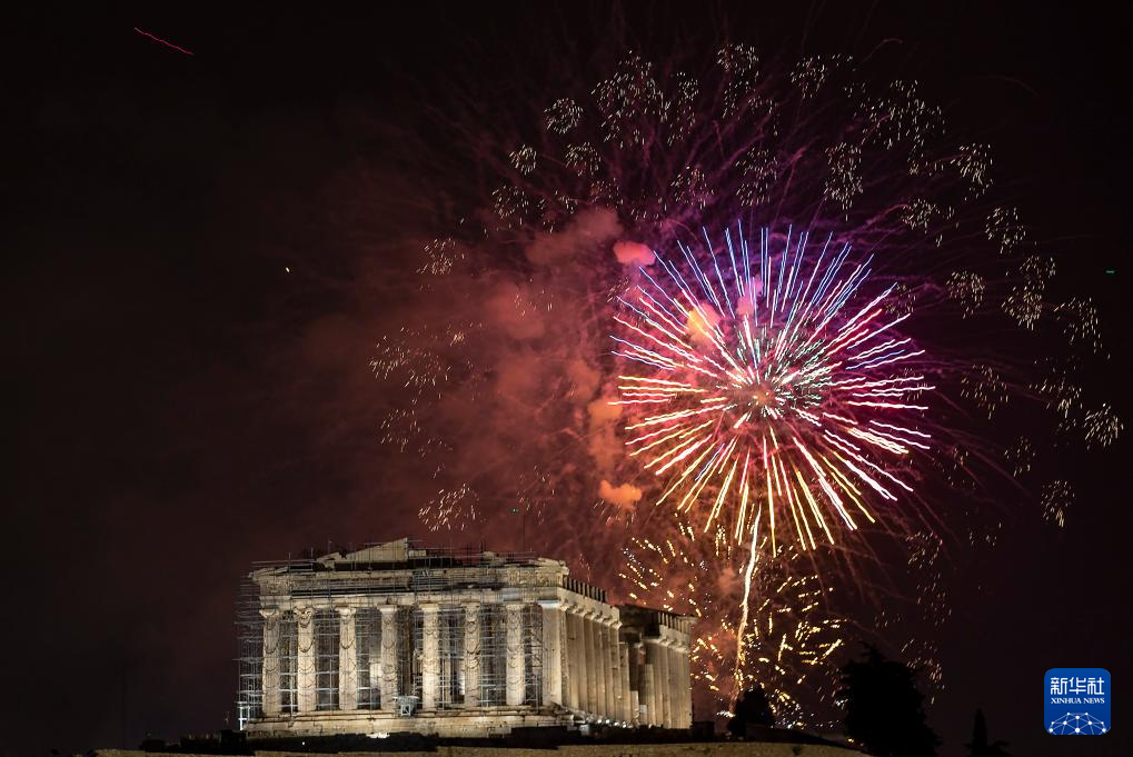 2024年1月1日凌晨,在希臘雅典舉行的迎接新年慶?;顒又校婊鹫樟裂诺湫l(wèi)城。