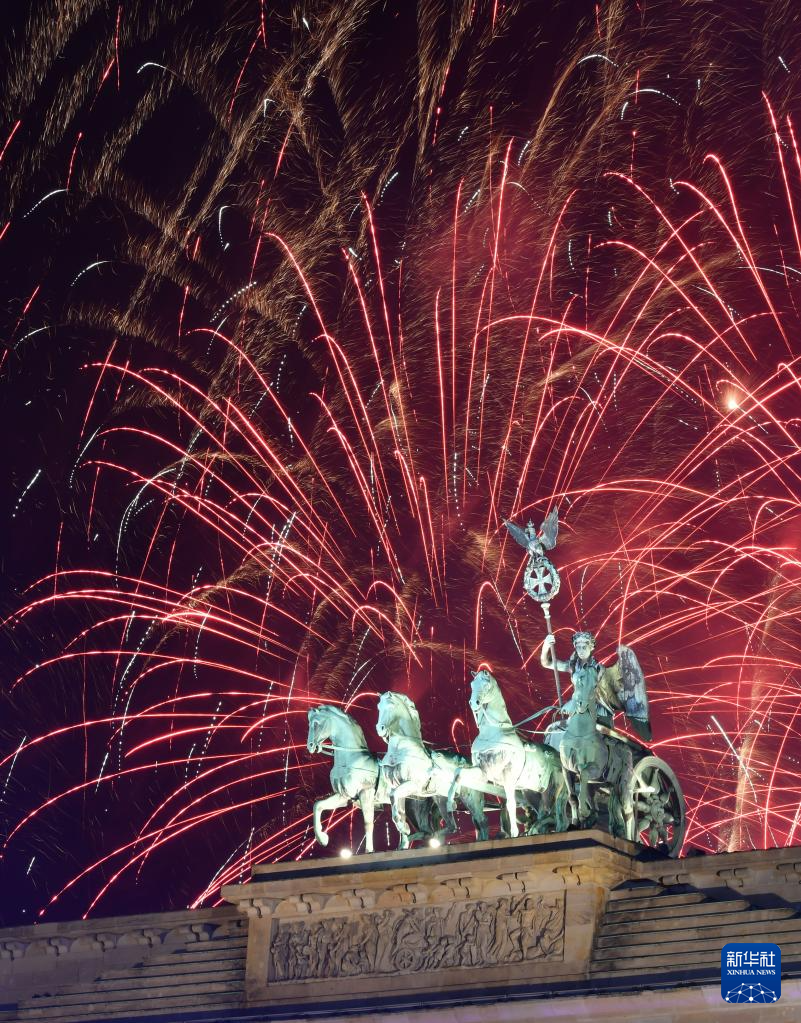 2023年12月31日晚,新年焰火在德國柏林的勃蘭登堡門上空綻放。