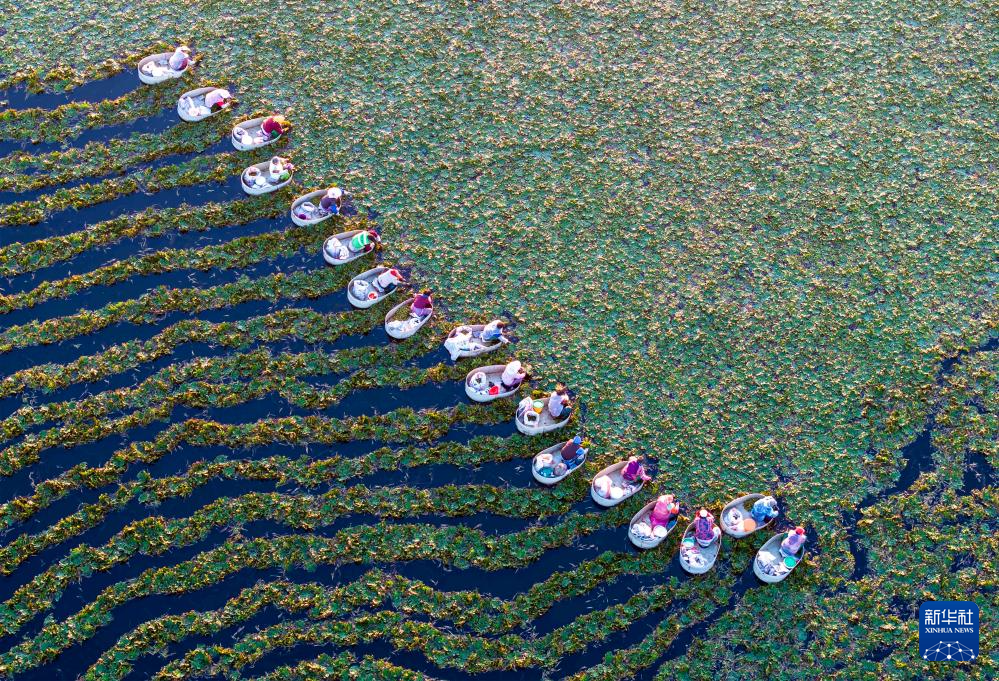 10月4日,農(nóng)民在江蘇省泰州市海陵區(qū)蘇陳鎮(zhèn)張家院社區(qū)菱塘里采摘菱角(無(wú)人機(jī)照片)。