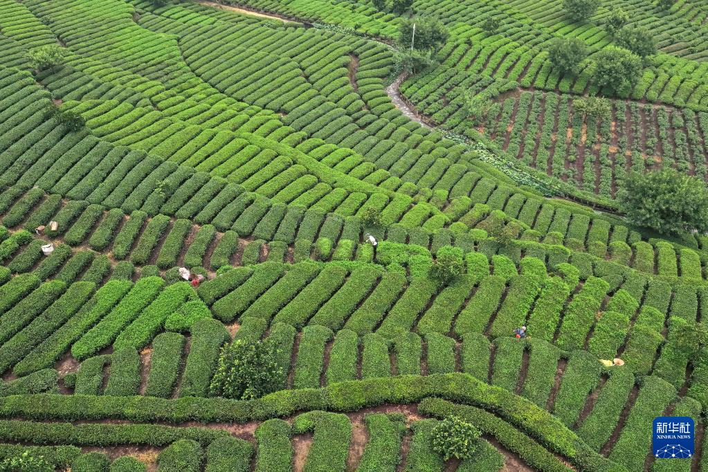 8月7日,茶農(nóng)在三峽庫區(qū)湖北省宜昌市秭歸縣茅坪鎮(zhèn)松樹坳村一茶園采摘秋茶(無人機(jī)照片)。